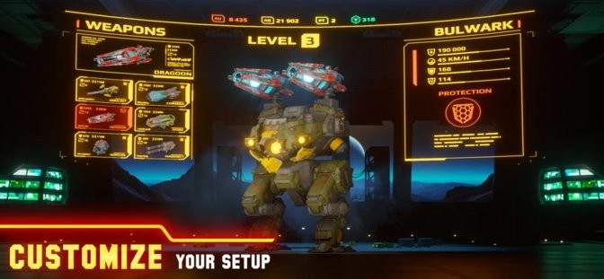 3、成长培养路线:通过战斗获取资源,强化机甲属性和武器性能。科技树系统允许玩家选择不同发展方向。