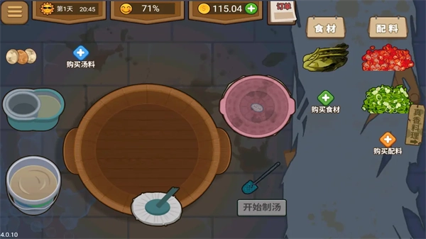 4.放置好食材后,往其中加入左下角蓝色瓶子里的水,这可是生命的源泉。随后开始煮汤,等汤的底部煮好就大功告成了。