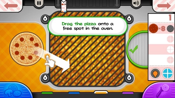 玩家正依据顾客要求的时间来烘烤披萨。顾客能够选择把披萨烘烤至计时器刻度盘上的不同位置。待披萨烤好,玩家点击它就能将其转移到下一个步骤。