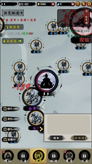 在游戏里,玩家需借助修炼实现进阶突破,通过放置挂机不断变强,从而改变命运,求得长生。游戏的世界观极为宏大,玩法体验也相当丰富。玩家不仅能在洪荒世界挂机刷怪,以此获取灵石资源,还可利用商店功能,获取法宝、炼器材料以及高级装备宝箱,这些皆是提升战斗力的关键要素。