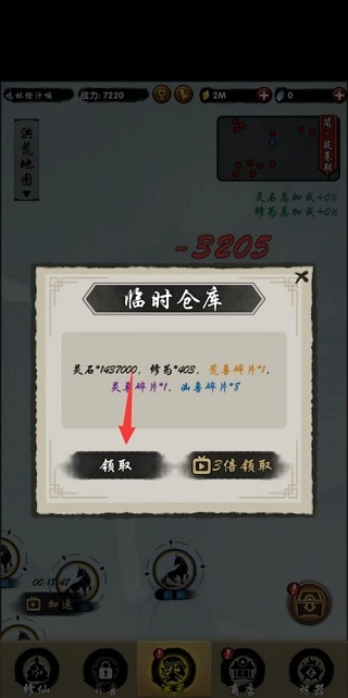 第二步:切换至洪荒页面,点击临时仓库,领取挂机所获修为。若修为不足,可继续挂机。