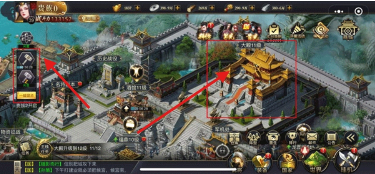 1. 位于最上方的大殿乃是主建筑,唯有对大殿进行升级,方可解锁更多的建筑与功能,解除更多限制。大殿升级需君主等级、现有建筑物等级、爵位等级等满足一定条件,且升级过程中会消耗银两、粮食、木材、铁矿,这些资源能够通过主城建筑生产以及城市资源采集获取。