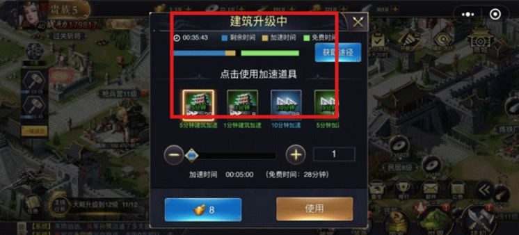 2、建筑升级位在最左边,仅有两个。这两个位置是用来给主城内各类建筑物升级的。升级时间能够加速,其消耗品与大殿相同,因此后续一定要留意这些资源的获取。尽量别让升级位闲置,毕竟后续你所需的建筑物等级会越来越高,所以只要消耗资源充足,且有闲置的升级位,就赶紧提升建筑等级。