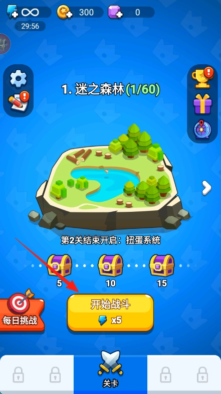 1. 于主界面寻觅到“开始战斗”按钮并予以点击,耗费5点蓝色道具,随即进入“迷之森林”第1关,开启冒险之旅。