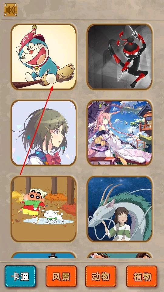 1. 点击“开始游戏”按钮进入,在卡通分类中挑选诸如哆啦A梦之类的图案,开启马赛克擦拭挑战。