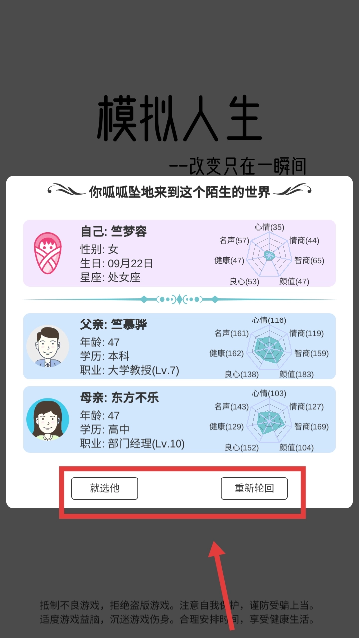 2、查看家庭属性,若想选择当前家庭,点击“就选他”;若想更换,则点击“重新轮回”~