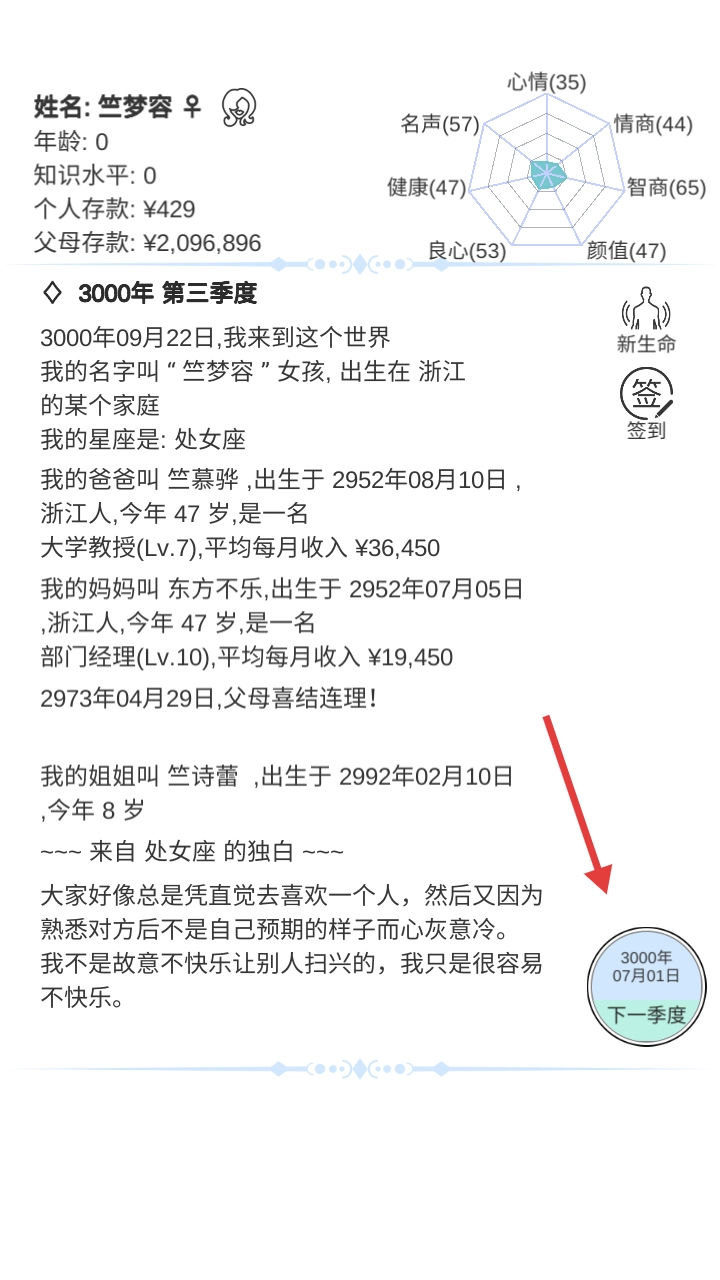 3、踏入人生界面,点击“下一季度”,推动时间前行,从而触发新事件!