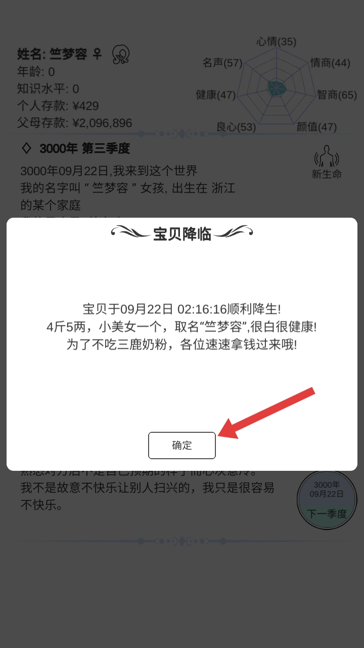 4、当出现“宝贝降临”的提示时,点击“确定”,然后继续开启你的模拟人生之旅吧!