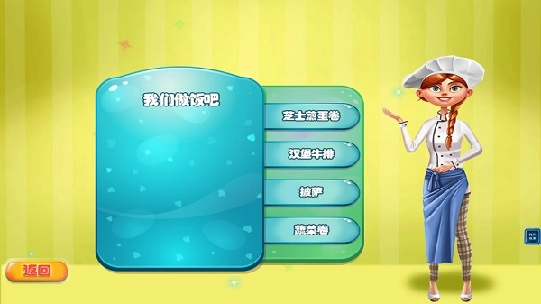 1、开启游戏后,首先要做的是从芝士煎蛋卷、汉堡牛排、披萨和蔬菜卷中挑选一种进行烹饪制作。