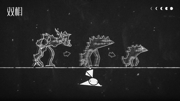 除此之外,病症在游戏里有着具象化的体现,其具体形象便是“猛兽”。“猛兽”如同主角一般,由玩家进行操控,并且它在地位上压制着主角——这就恰似疾病对人的掌控。“猛兽”的形象设计大多源于蜥蜴,“双相情感障碍”这一病症与蜥蜴“冷血动物”的特性,在人们的感性认知方面存在诸多契合点。所以这个角色主要由三角形构成,目的是给人一种尖锐的印象。随着游戏剧情的不断推进,“猛兽”在游戏中还会出现不同的形象转变。病症冷酷无情,“猛兽”令人畏惧,然而随着“我”在迷途中不断前行,“我”终将寻找到与之平和共生的办法。