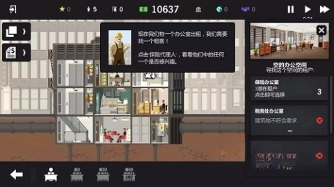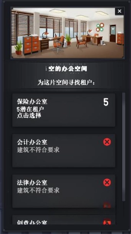 3、接下来选中空间内的提示,此时你会在右上角发现有多种不同类型的租户供你挑选。需留意的是,部分租户要求大厦满足特定条件,才能够顺利入驻。滑动鼠标便能查看这些条件,记得提前做好相应准备!
