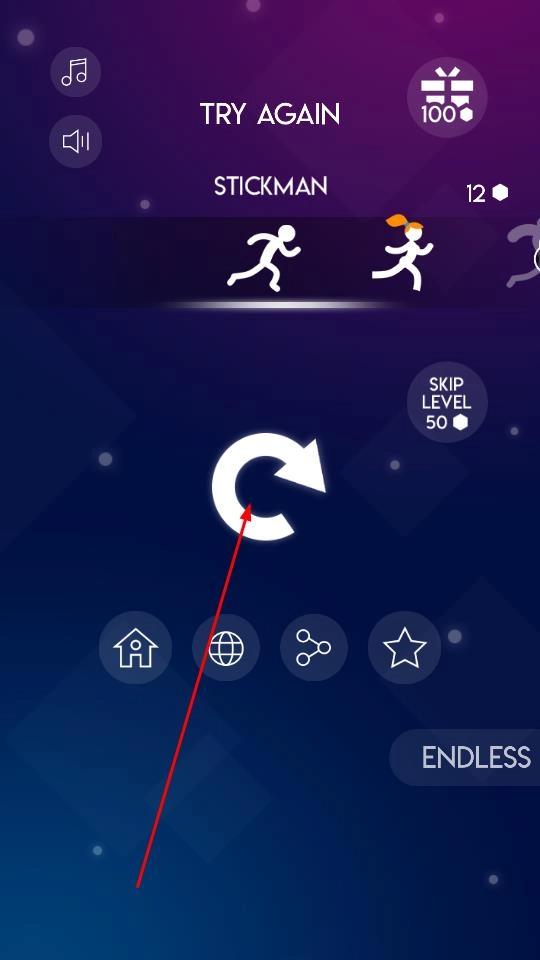 3、要是挑战失败,点击中间的白色重置箭头能够重新开启当前关卡。右侧的“SKIP LEVEL”功能,消耗50钻石就能跳过此关。下方的房屋图标可返回主页,而globe、分享、星星图标则延续启动页的功能。