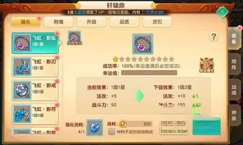 在游戏里,装备乃是提升战力的关键途径,巧妙搭配装备能够大幅强化角色属性。你不仅能够对装备进行强化、附魂以及提升品质的操作,还能镶嵌灵石。而多余的装备亦可通过熔炼,以此增强人物属性,实现战斗力的切实提升。