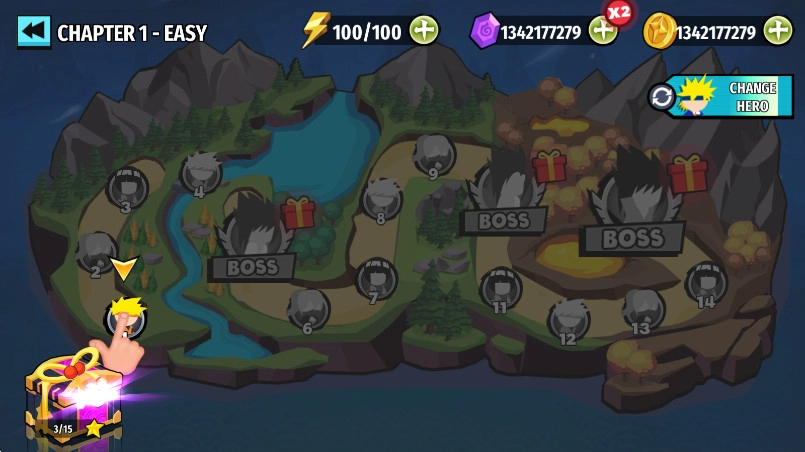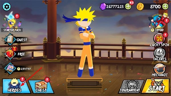 1、第一步,打开《火柴人忍者大战》,点击左下角的“heroes”。