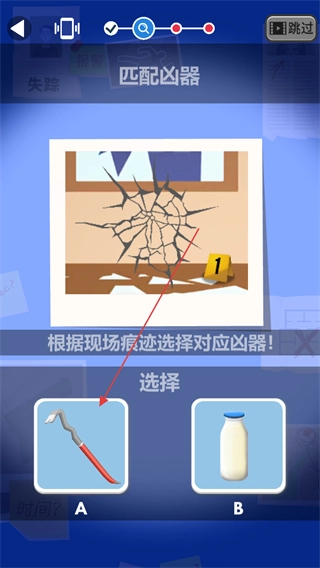 2、进行凶器匹配,依据现场所留痕迹挑选与之对应的凶器,例如按照窗户的破损形态来选择工具A 。