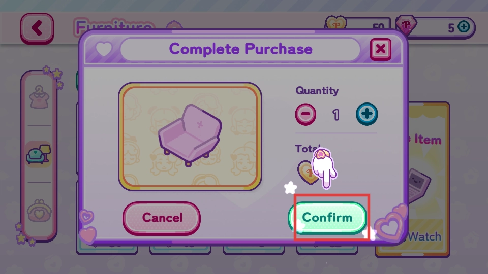 4、在购买家具时,点击【Confirm】,即可完成购买操作,进而装饰场景,提升游戏体验。
