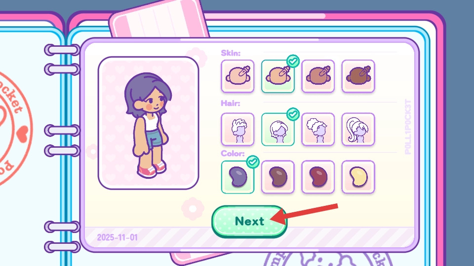 1. 自行定义角色外观,挑选皮肤、发型以及颜色之后,点击【Next】,即可进入游戏。