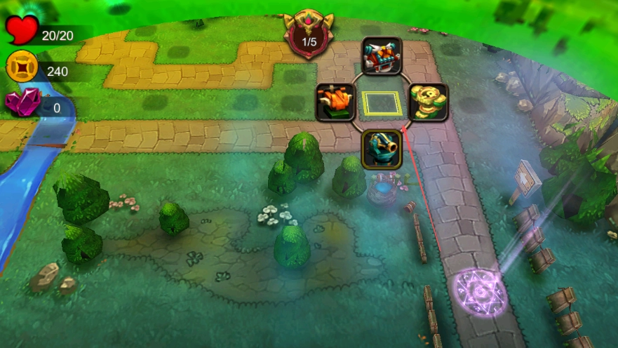 1. 开启游戏后,留意左上角显示的生命值20/20、金币240等各类资源,接着点击箭头指示的地方来放置防御塔。