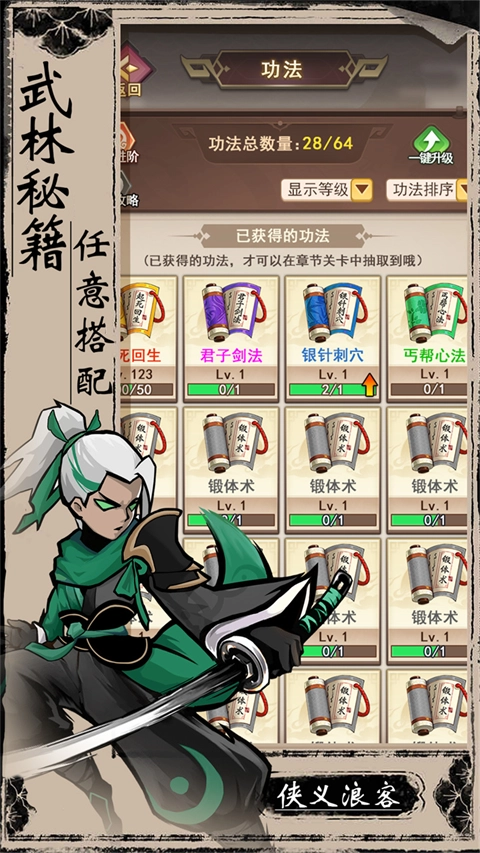 2、每当成功通过一关后,便会进入功法选择环节。此时,你可以从给出的功法里挑选一本。你所选的功法能够提升侠客的属性,对后续战斗有所助力,需依据自身需求合理进行选择。