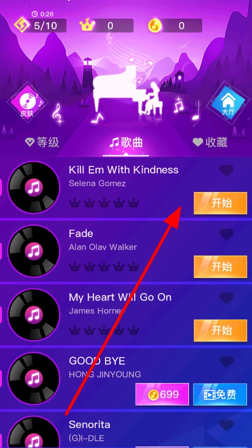 2、在音乐列表里,挑选你想要挑战的音乐,点击“开始”,就能进入相应音乐的节奏游戏场景。