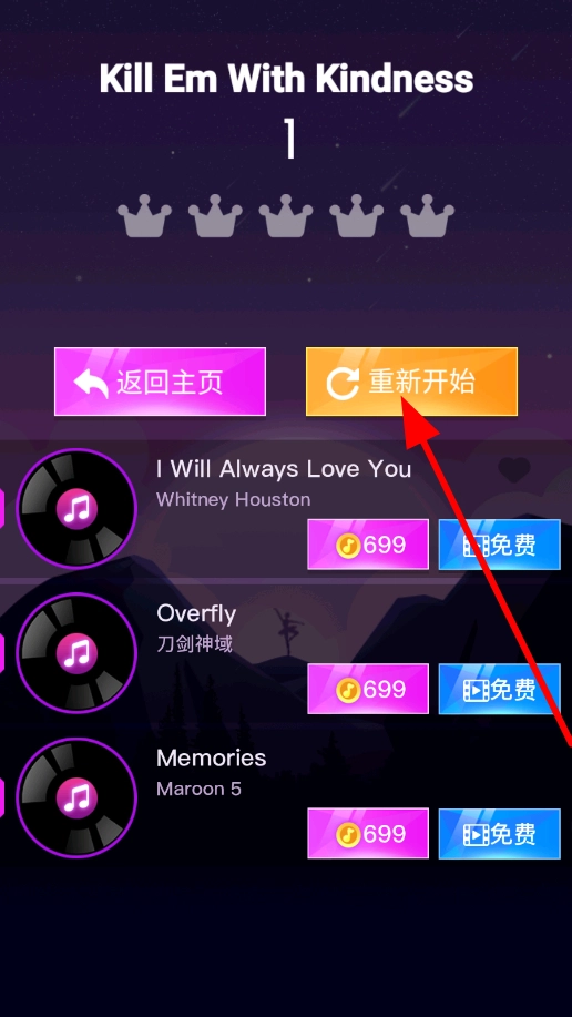 4、要是在游戏里出现操作失误,致使方块没有被接住,你可以点击“重新开始”,再次对该音乐发起挑战,力求获得更出色的游戏表现。