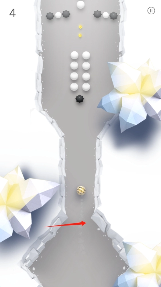 2、于游戏里,巧妙地操控球体,避开白色球体与黑色尖刺状的障碍物,与此同时收集黄色菱形道具,力求获取更高的分数。