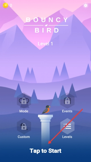 1. 轻点“Tap to Start”,进入“Level1”,操控小鸟在山间石柱场景中跳跃,目标是抵达终点柱。