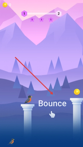 2、当遇到石柱有间隔时,点击屏幕使小鸟进行弹跳,精准把握时机,让小鸟落在标有Bounce的提示区域,借助该区域的弹力,跳至下一根石柱,从而避开坠落的风险。