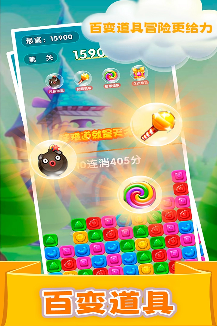 玩家在游戏里可以体验到别具一格的三消玩法,当消除三个及以上同色方块时,就能收获更丰厚的分数奖励,还有众多关卡正等着玩家去挑战呢。