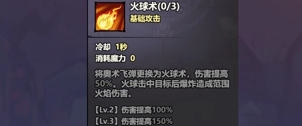 完成学习后,你将继承上级技能“奥术飞弹”的基础伤害,并且在此基础上额外获得50%的伤害提升。不仅如此,当技能击中敌人时,还会触发爆炸效果,对目标周围造成范围伤害。在后续阶段,该技能能够进一步进阶为“烈焰”或“聚焦”两种不同形态。