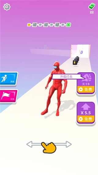 在《猛男冲冲冲》国际服里,玩家能操控健身小人在跑道上跑酷,游戏会设置各式各样的陷阱,玩家得滑动屏幕来控制小人移动,避开敌人的攻击。国际服还准备了多种不同的皮肤样式,玩家可以用游戏里收集到的金币奖励去购买兑换,随着收集的金币越来越多,玩家操控的小人会变得更有肌肉感,成为更厉害的猛男。