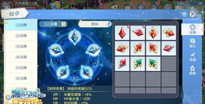 每个法阵设有5个形状各不相同的格子,能够配置与之形状匹配的纹章;若在同一个法阵上配置多枚属于同一位女神的纹章,就可以触发特殊的「加持效果」。