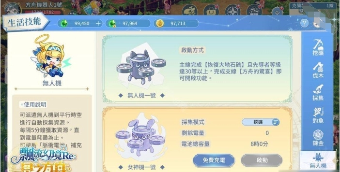 玩家过去常用的采集方式是携带「吸尘器」前往采集点,《飘流幻境 Re:星之方舟》为了让游戏体验更流畅便捷,新推出了资源采集辅助系统「无人机」。玩家在推进初期主线剧情时,很快就能解锁这个功能,只需简单设置,就能随时从方舟派出无人机进入平行时空,自动开展资源采集工作。