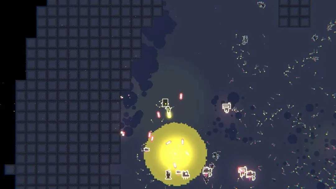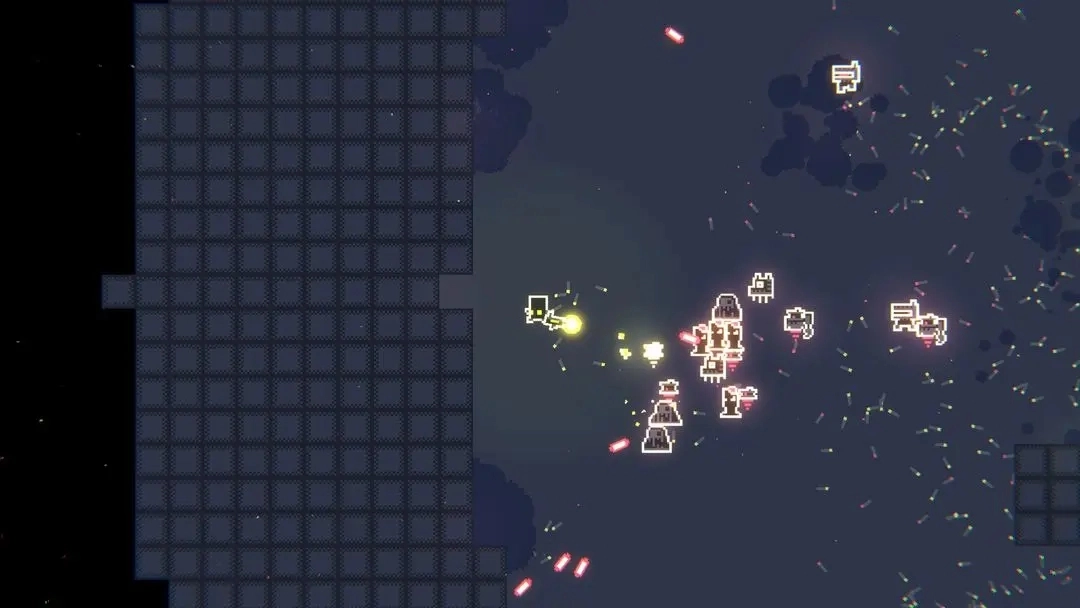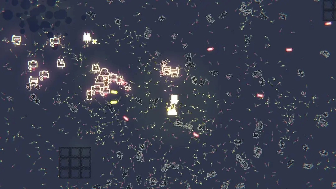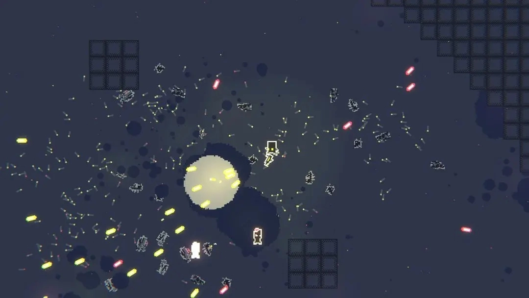 2采用二维像素艺术风格,画面中点缀着赛博朋克特有的霓虹色调。游戏几乎没有传统的界面和交互元素,完全专注于核心体验。二维战斗系统的视觉呈现十分出色:每次射击都会伴随弹壳弹出的细节,被击败的敌人躯体也会持续保留在场景中,随着战斗推进,满屏的碎片与残骸营造出强烈的视觉冲击,带来了相当解压的游玩感受。