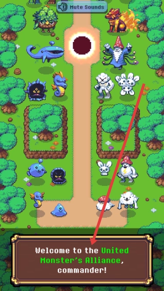 进入United-Monster's-Alliance游戏的初始地图场景后,阅读底部对话框中的欢迎语,借此熟悉怪物联盟的世界观,为开启防御任务做好准备。