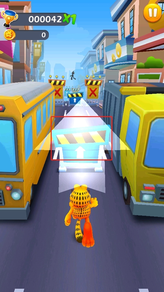 当路面出现阻碍时,按照指引向上滑动屏幕,就能让加菲猫跃起避开障碍。记得提前规划好前进路线,避免因碰撞而中断奔跑。