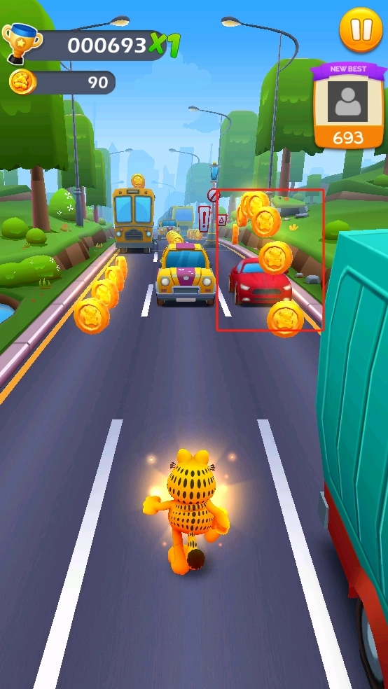 搞怪障碍互动:障碍物自带喜剧效果,会遇到突然窜出的欧迪抢金币,或是滚动的烤鸡引诱加菲猫跑偏,躲避过程充满意外笑点,不缺趣味性。