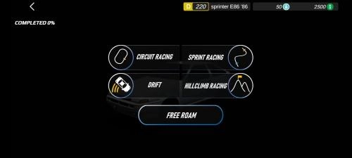 3、登录完成后,可看到包括赛车、短跑、漂移和爬坡比赛等游戏模式,玩家可自行选择体验,这里以赛车模式为例。