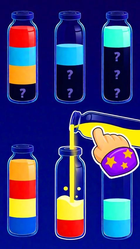 ◆只有当水连接到相同颜色的区域,并且试管留出足够空间时,才能进行倒水操作。