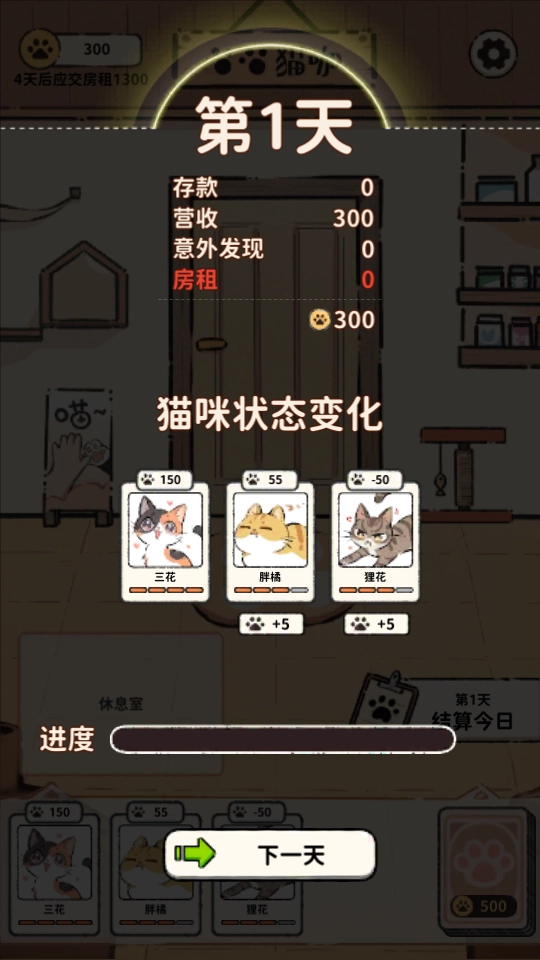 开局要特别留意猫咪的精力状态,避免所有猫咪同时精力不足。在确保下一局能凑够三只猫上场的前提下,尽量多安排猫咪工作;要是实在没法保证这点,哪怕房间空着也别让猫咪累着,不然会严重影响后续赚钱(除非距离第五天的房租只差很少一点)。