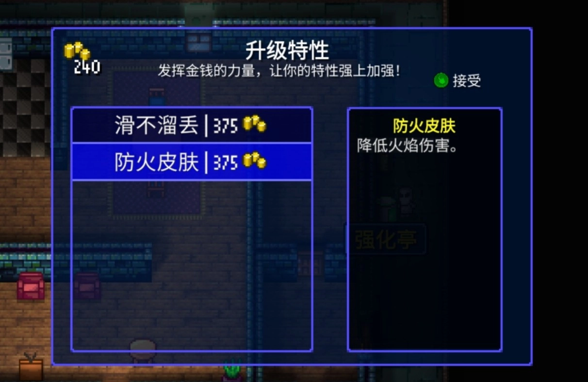 降低火焰伤害,火焰伤害数值会依次降至10→6→0(当火焰伤害归零时,不会再受到伤害,且火焰会立刻熄灭),不过这个效果的实际用处不算很大。