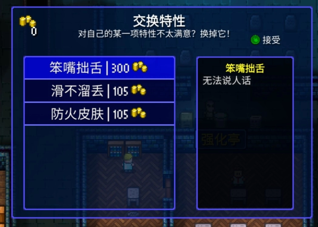 交换技能仅会在同一档位内进行。和笨嘴拙舌处于同一等级的技能有小精灵与和平主义者,个人不太建议进行交换;但如果到了游戏后期仍未获得翻译器,也可以尝试赌一把——要是换到和平主义者就血赚,换到小精灵则会很糟糕。滑不溜丢与防火皮肤属于同一档位,不过这个档位包含的技能较多,像凌波微步、爆炸幸存者、人多力量大(更安全)等都是比较有代表性的;由于该档位技能数量繁多,所以每层仅能交换其中的某几种。防火皮肤若不升级几乎没有作用,大家可以花费105金币去交换它;而滑不溜丢对外星人来说还是非常实用的,因此不推荐交换这个技能。