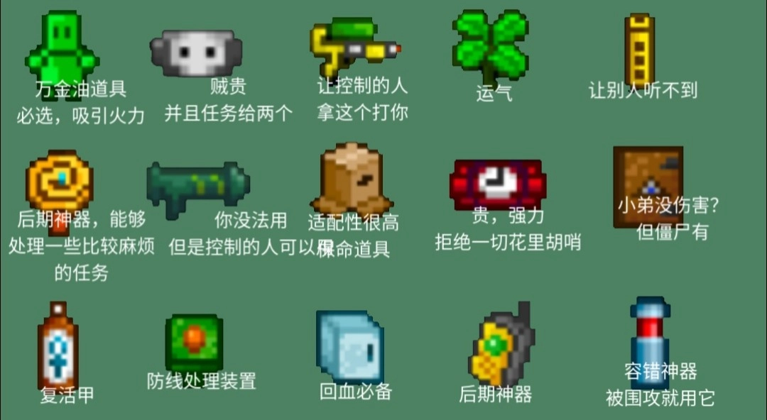 和增伤药品类似的是武器,武器里除了火箭筒都不建议选。因为弹射类武器给被控制者时很难发挥作用,没法灵活调整方向,这类道具对被控制者的收益不如其他角色。但火箭筒给被控制者后,既能用来炸开墙壁,爆炸伤害还能解决这个NPC,让我们给的火箭筒掉落回来,实用性挺高的。