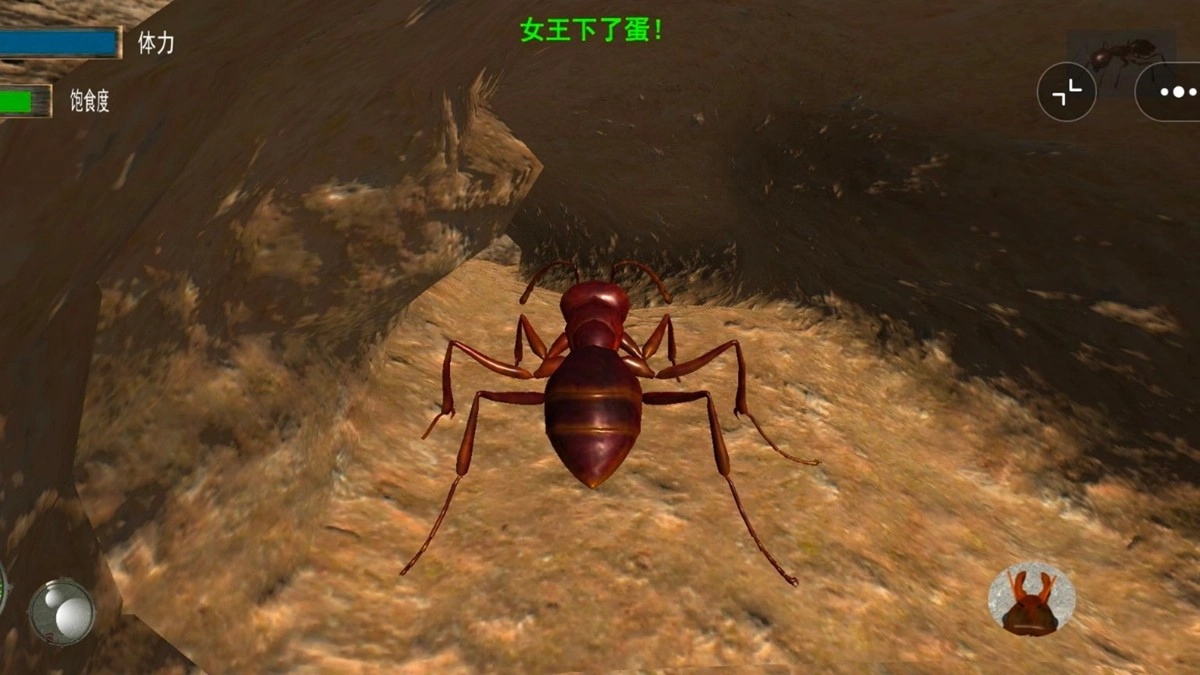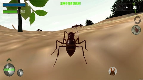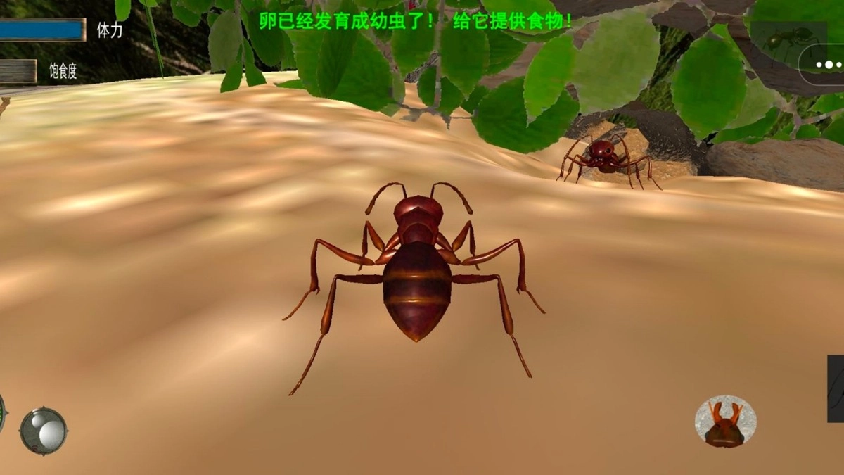 游戏里通过左侧轮盘来精准操控蚂蚁的移动方向,当找到食物资源后,点击右侧的攻击按钮清理掉周围的障碍,然后引导工蚁开展采集工作。