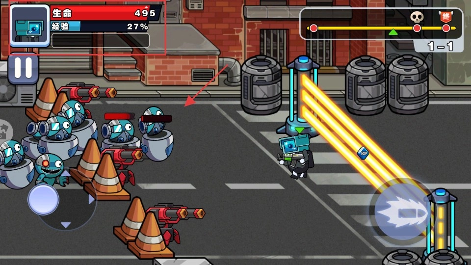 战斗时要留意【生命】数值(比如【495】这样的显示)和【经验】进度(比如【27%】这类标识),通过灵活走位避开多个敌人,不断积累经验让自己变得更强。
