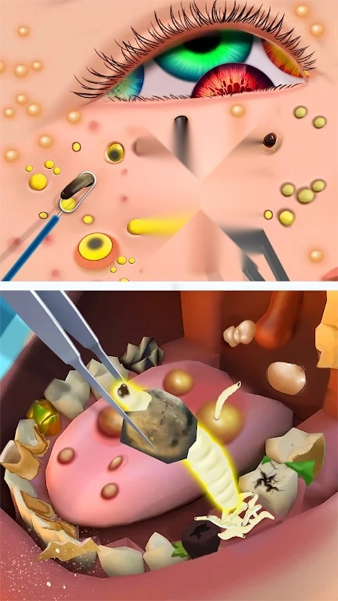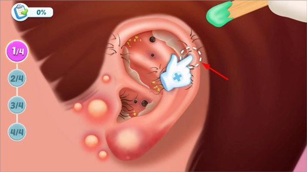 进入游戏后先从新手关卡玩起,这里主要是引导玩家学习如何为病人清理耳朵里的脏东西以及处理发炎的部位。