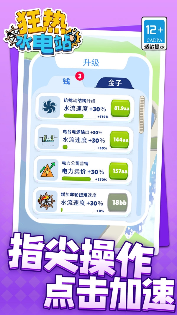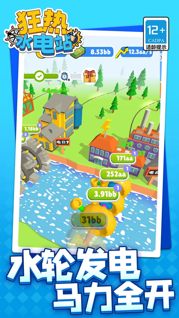 通过轻松点击或放置操作获取收益,再用所得资金建造新的水车,以此逐步扩大发电的规模。