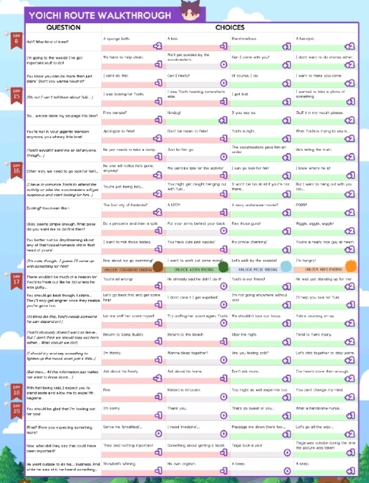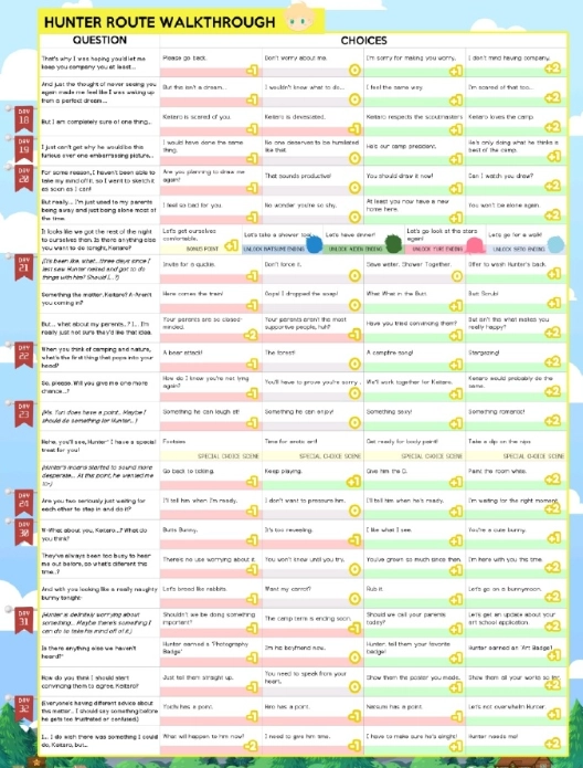 Keitaro Nagame是游戏的主角,这位19岁的大学生身高168cm,体重55kg,血型为A型,生日在4月8日。他有着拍照和写日记的爱好,总是随身携带相机。在夏令营期间,他得和其他营员搞好关系,妥善处理大家之间的分歧,这样才能阻止营地被关闭。