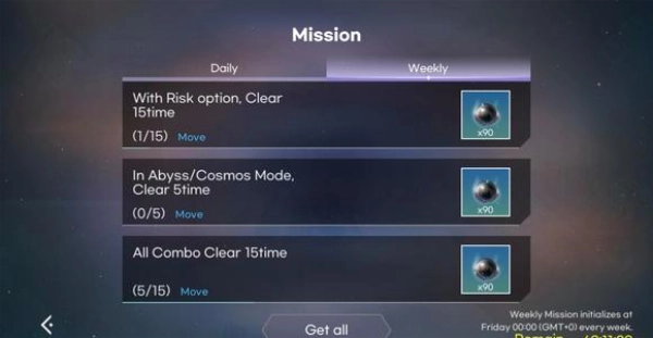 任务系统包含每日任务与周任务两个板块。点击菱形图标能够收起或展开任务面板,展开后即可查看各项任务的详细信息。若想直接前往任务对应的位置,点击蓝色的“move”按钮即可实现跳转。需要注意的是,部分每日任务可能关联到尚未购买的曲目,完成这类任务后,任务会重新处于锁定状态。