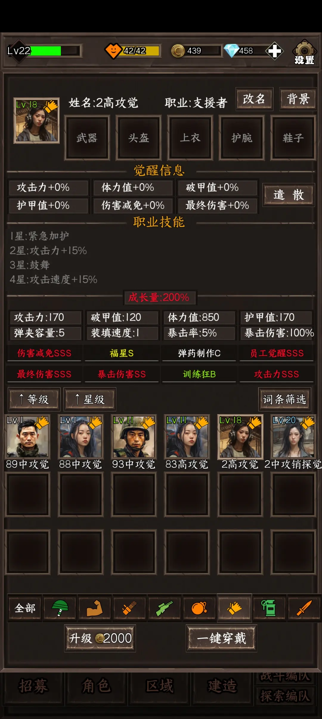 员工可划分为四类:肉盾、输出、辅助与治疗。肉盾的典型代表是防卫者,其成长数值处于185至200区间,核心词条为伤害减免以及员工觉醒。输出类包含粉碎者、速射者、狙击者和猎杀者,成长量在190到200之间,关键词条有员工觉醒、攻击力、最终伤害、暴击率和暴击伤害。辅助类如干扰者、投掷者,成长数值范围是180至200,主要词条与输出类相同。治疗类以支援者为例,成长量处于190到200区间,主要词条和输出类一致,但该类员工伤害较低,不适合作为主力输出角色。